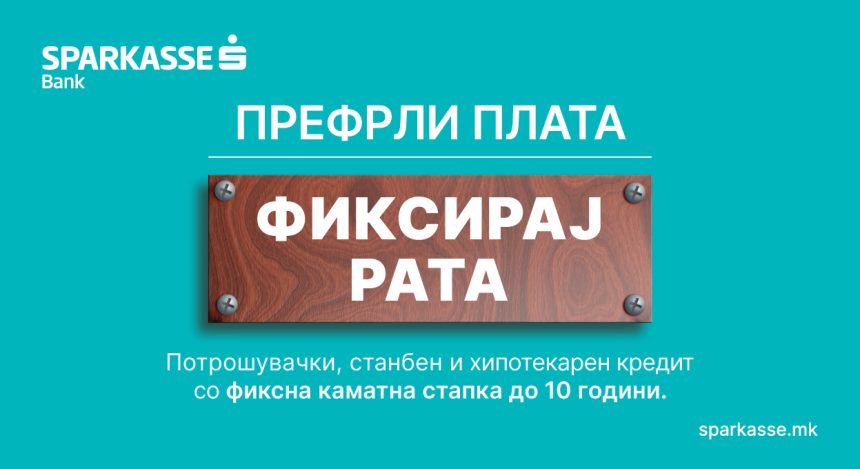 Шпаркасе Банка АД Скопје со нова атрактивна понуда за сите заинтересирани клиенти – „Префли плата, фиксирај рата“. Со оваа уникатна понуда, сите клиенти што ќе ја префрлат својата плата во Шпаркасе Банка, ќе добијат единствена можност да аплицираат за потрошувачки, станбен или хипотекарен кредит со фиксна и атрактивна каматна стапка на 10 години за рефинансирање на своите обврски или нови потреби.