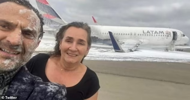 Двајцата се прикажани како се смешкаат пред камерата, а лицето на мажот е сè уште е покриено со бела пена што се користила за гаснење на огнот во авионот.