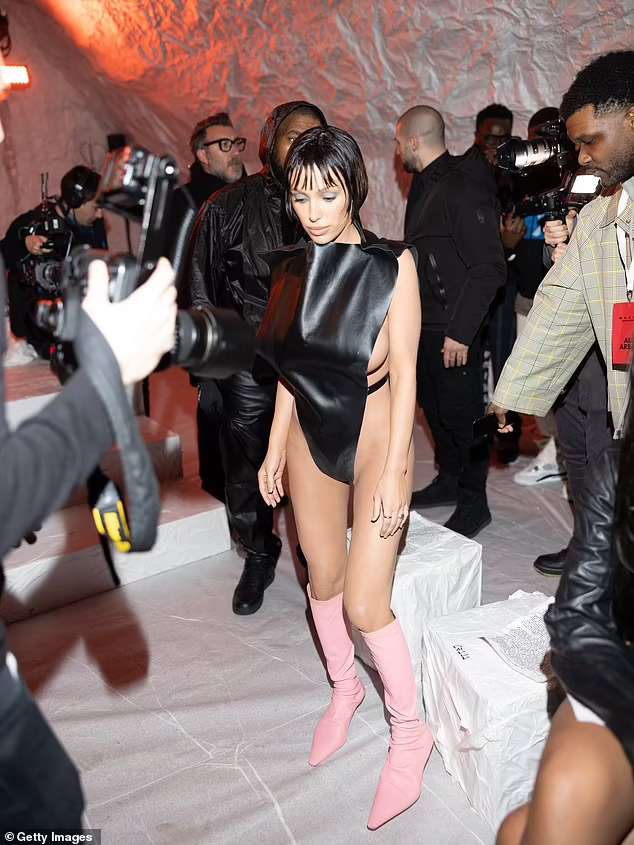 Облечена во кратки розови чизми, Бјанка му се придружи на својот сопруг во првиот ред за време на ревијата. Канје носеше црна јакна и соодветни панталони додека се бакнуваше со Бјанка и тие смело позираа пред камерите.