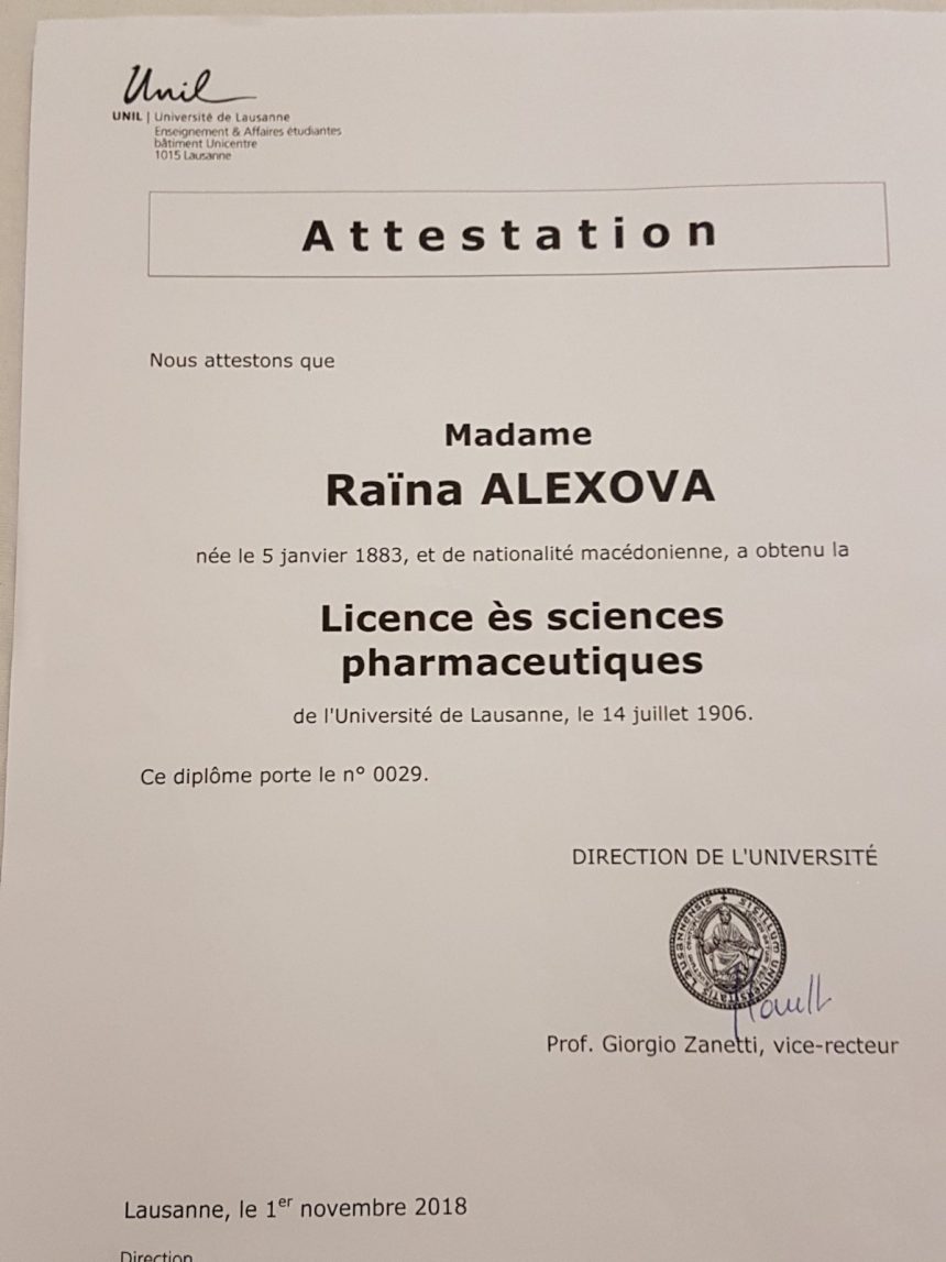 Првата дипломантка на факултетот во Лозана, Рајна Алексова од Битола, уште во 1906 година знаела што е и од каде е