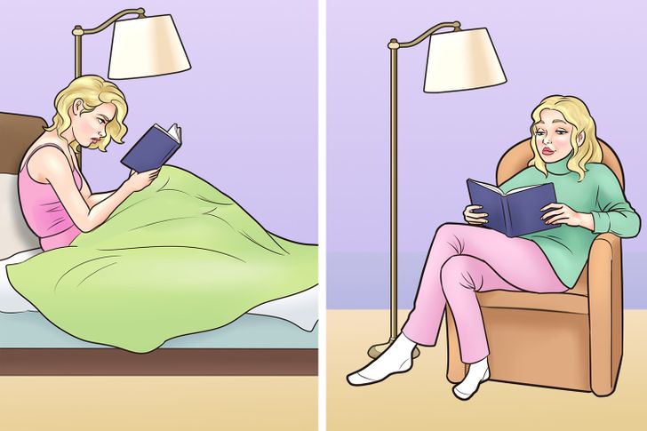 Навиката да читате неколку страници од вашата омилена книга пред да заспиете може да доведе до вкочанетост на рамената и грбот. Читањето во кревет предизвикува напнатост на ‘рбетот и мускулите во долниот дел на грбот, што пак доведува до болка. Ако читањето книга пред спиење ви помага да се опуштите по напорниот ден, инвестирајте во столче со добра поддршка на ‘рбетниот столб.