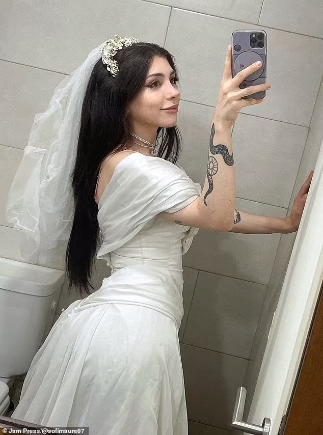 Софи Море, од Аргентина, првпат ја објави венчавката во февруари, со фотографии на кои е со долг бел превез и златна тиара.