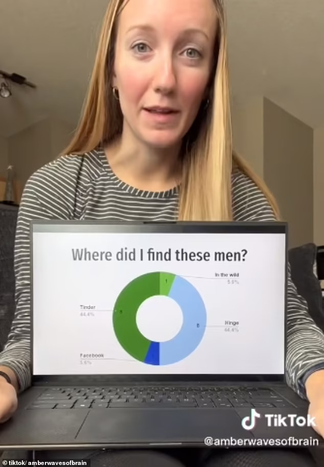 Амбер потоа покажа табела со пити на која точно се гледа каде ги нашла овие мажи, вклучувајќи ги Тиндер, Хинџ, Фејсбук или „во дивината“.