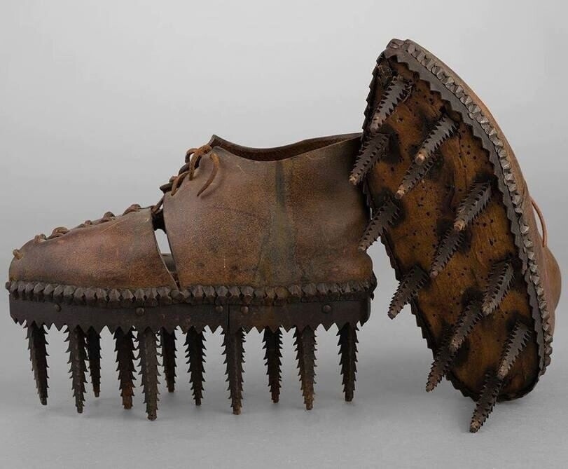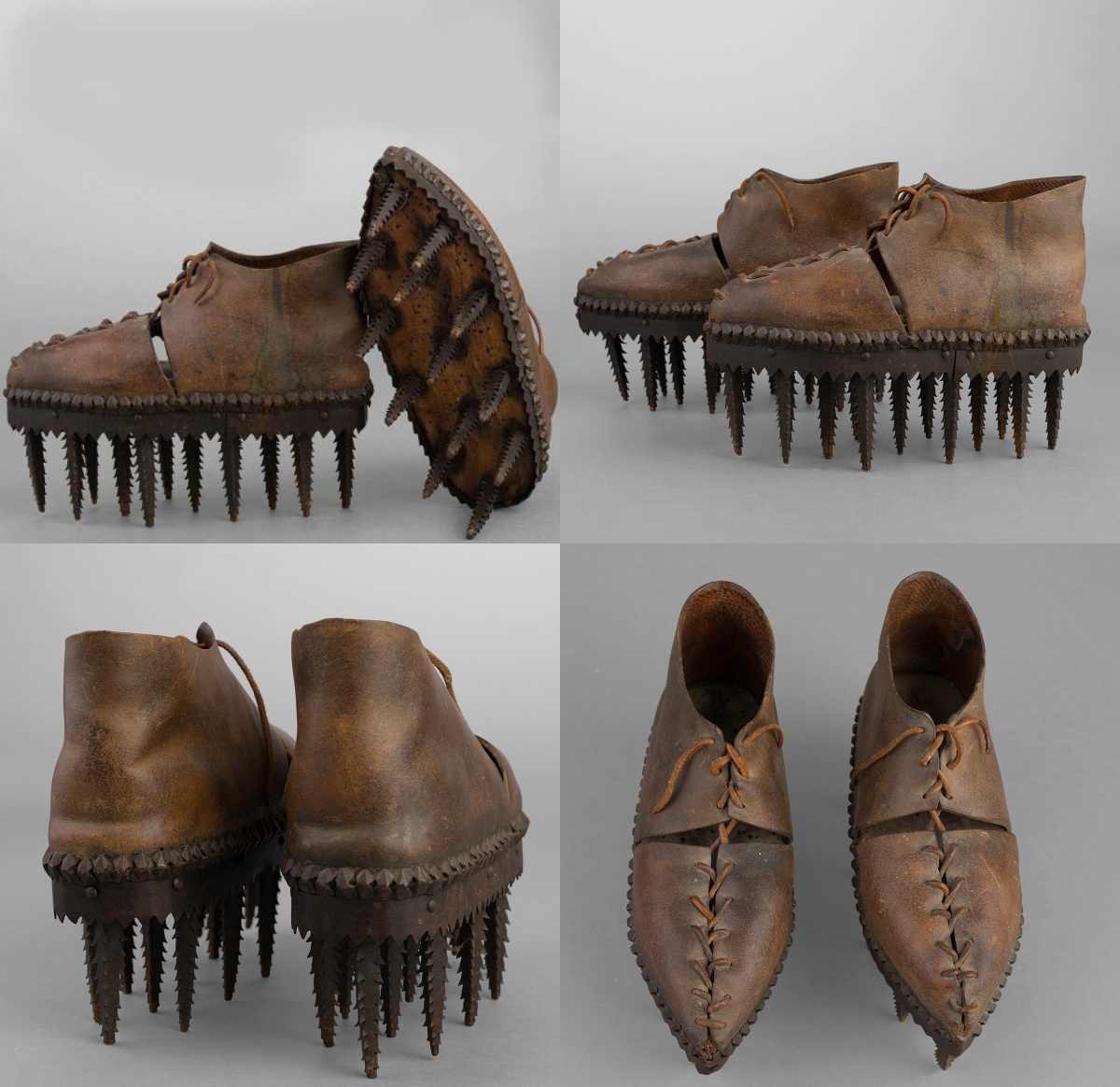 Овие чевли, изработени во градот Ардеш, Франција, во 19 век, имаат тежина од 2 килограма по чевел, со 10-сантиметарски зашилени клинци на ѓонот. Ѓонот е направен од 3-сантиметарско дрво, а горниот дел е од кожа. Чевлите биле наменети за лупење костени и жолчки, чии јатки служеле како храна за свињи.
