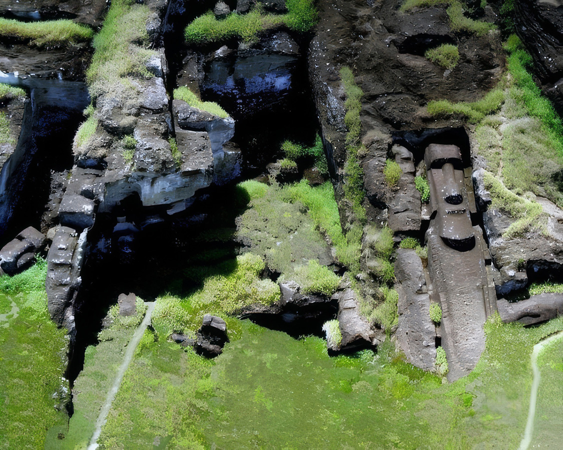 Во десниот дел на фотографијата е прикажана една од статуите Моаи на Островот Пасха во Тихиот Океан. Таа е лоцирана во каменоломот Рано Рараку и сè уште не е одделена од основата на карпата. Се смета дека монолитната статуа била создадена од домородното население – Рапанујците, помеѓу 1250 и 1500 година, но поради непознати причини не била поставена во исправена положба, како другите статуи на островот.