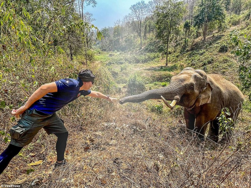 31-годишниот слон по име Плај Танг ја подаде сурлата за да ја допре раката на докторот Патарапол Манеон за време на неочекуваната средба овој месец.