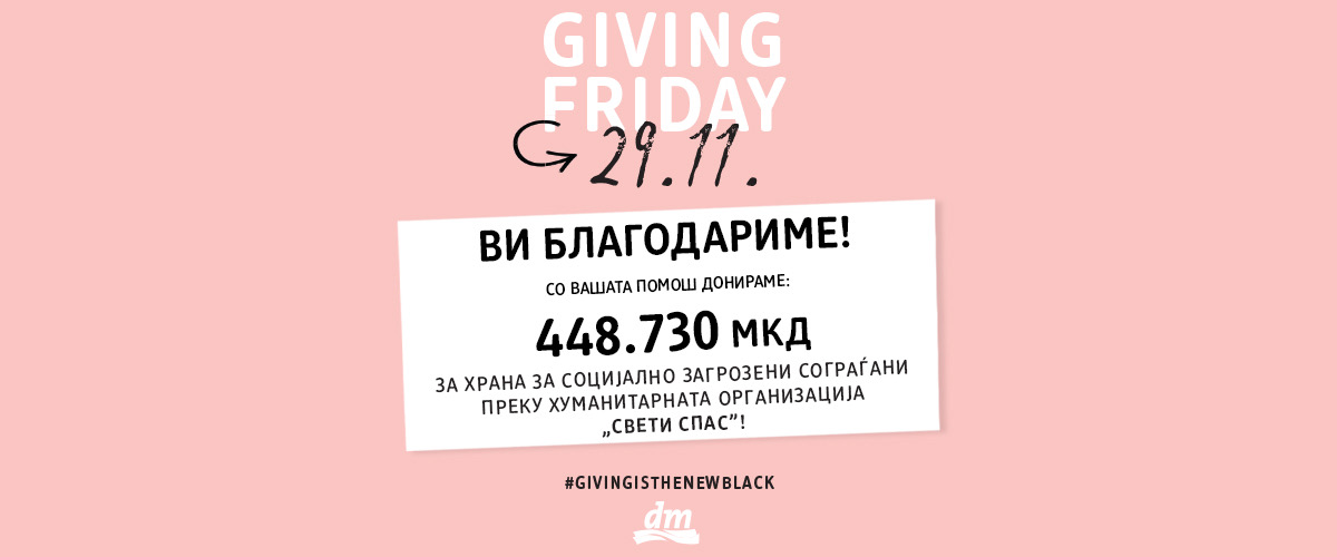 Започнувајќи од 2019 година, општествено-одговорната компанија dm под слоганот „Giving is the new black“ ја спроведува оваа активност во нашата земја, при која секој Black Friday, наместо попусти, компанијата им нуди можност на своите купувачи да се вклучат во една филантропска активност, во која компанијата донира 5% од вкупниот промет од сите dm дрогерии остварен на овој ден во хуманитарни цели!