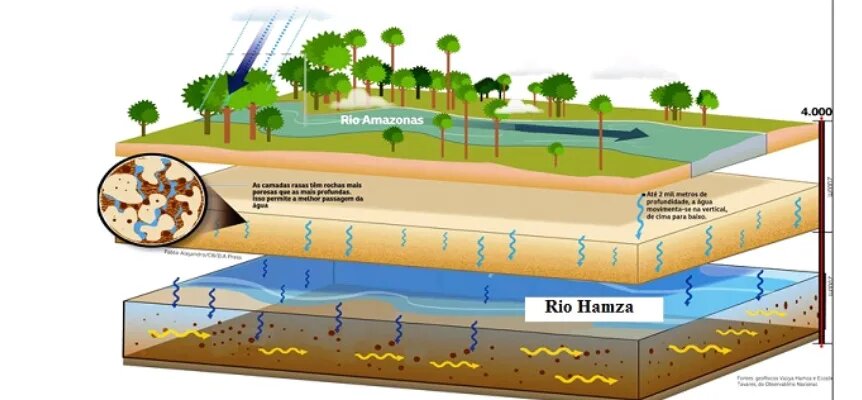 Во Националната геофизичка опсерваторија на Бразил, истражувачите одлучија да ги искористат длабоките дупки што биле пробушени од Petrobras во 70-тите и 80-тите при потрагата по нафта и гас. 241 бушотина низ басенот на Амазон испраќале податоци за температури на разни длабочини. Необични температурни осцилации на некои слоеви веднаш ги насочиле научниците – таму има вода, која се собира од површината и се движи низ порозни седиментни карпи, потоа слично како реката на површината, завршува во океанот. Податоците пак, покажаа дека Хамза почнува со вертикален тек уште од Перу, а под бразилскиот Акка се претвора во хоризонтален тек поради тврдите карпи.