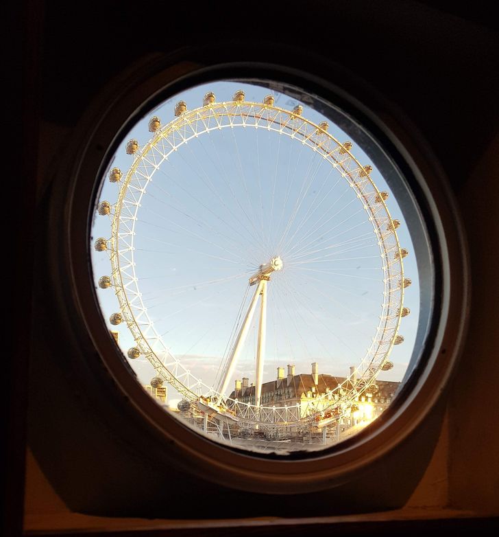 „Слика од Лондонското око низ прозорецот на брод што плови на Темза“