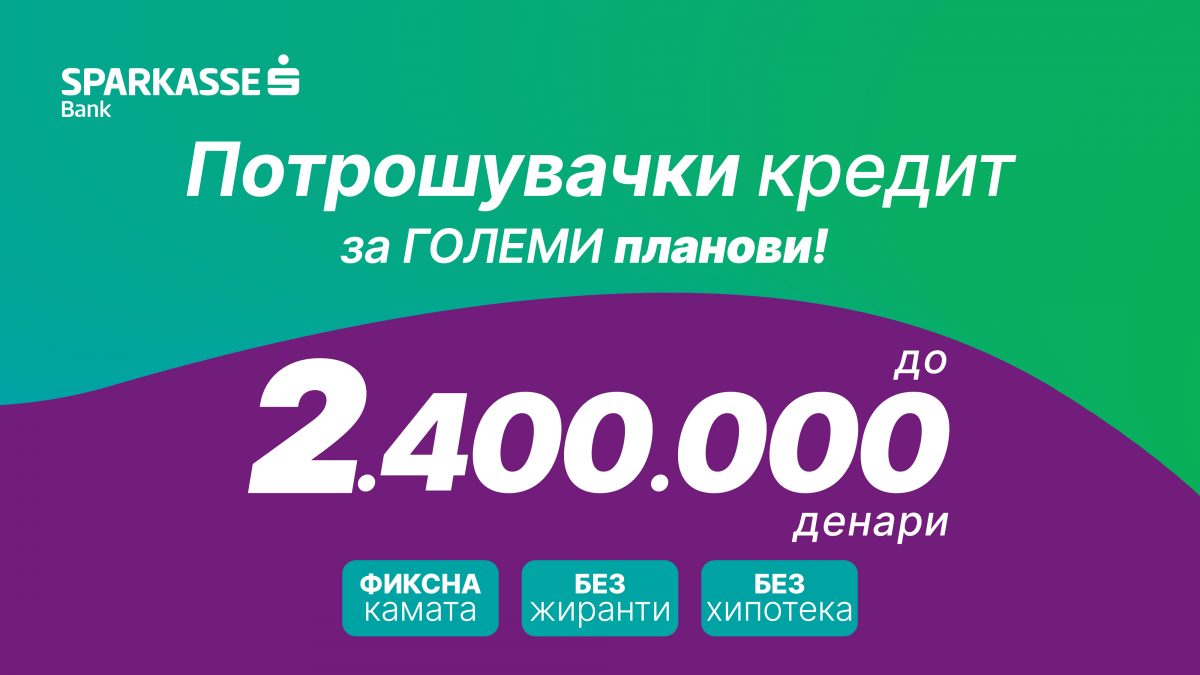 Шпаркасе Банка го претставува потрошувачкиот кредит со највисок износ на пазарот – до 2.400.000 денари, создаден за да им овозможи на клиентите поголема финансиска слобода и стабилност. Со овој кредит, клиентите добиваат пристап до значителни финансиски средства за своите лични планови – без хипотека, без жиранти и со фиксна каматна стапка за целиот период на отплата до 95 месеци.