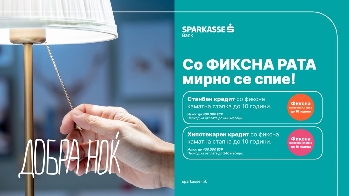 Покрај потрошувачкиот кредит, Шпаркасе Банка во оваа атрактивна понуда нуди и станбени и хипотекарни кредити со фиксни каматни стапки, кои овозможуваат фиксна месечна рата и сигурност при долгорочно планирање. Со максимален износ до 400.000 евра и фиксна каматна стапка за станбен и хипотекарен кредит, клиентите можат да планираат стабилна иднина без грижи за променливи месечни рати.