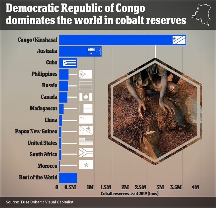 Резервите на кобалт во Конго се надвиснуваат над оние на остатокот од светот. Почнувајќи од 2019 година, Конго имал 3,6 милиони тони кобалт во својата земја, три пати повеќе од следната највисока, Австралија. Куба, Филипините, Русија, Канада, Кина и Мадагаскар исто така имаат мали количини – како и Северна Америка.