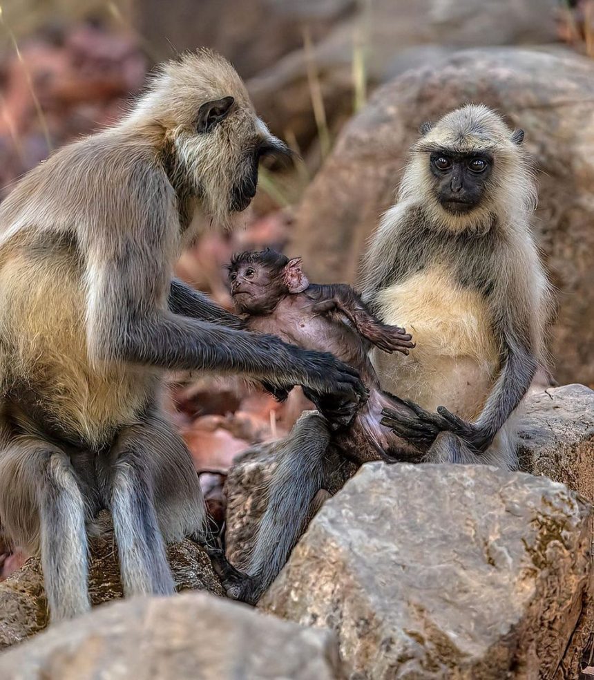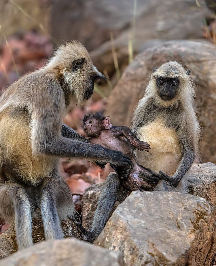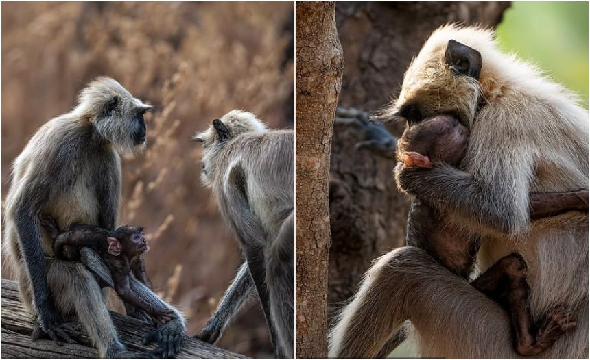 Овие фотографии до доловуваат срцезатоплувачкиот момент кога мајка мајмун го раѓа своето новороденче право во прегратките на нрговиот грижлив татко, во Индија.