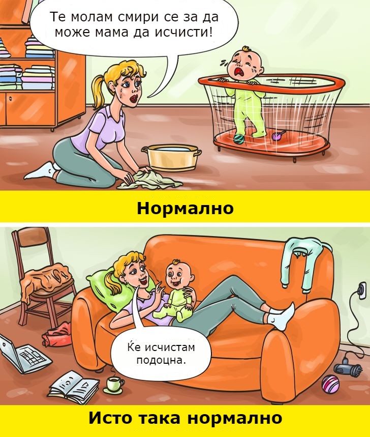 Понекогаш мајките и татковците треба да си дадат пауза и само да се релаксираат. Нема ништо лошо во малку неред дома. Мирот на родителите е поважен од чистотата.