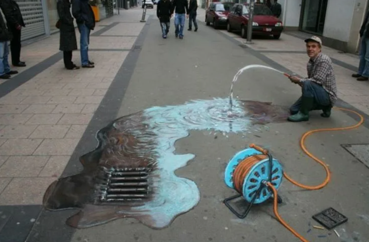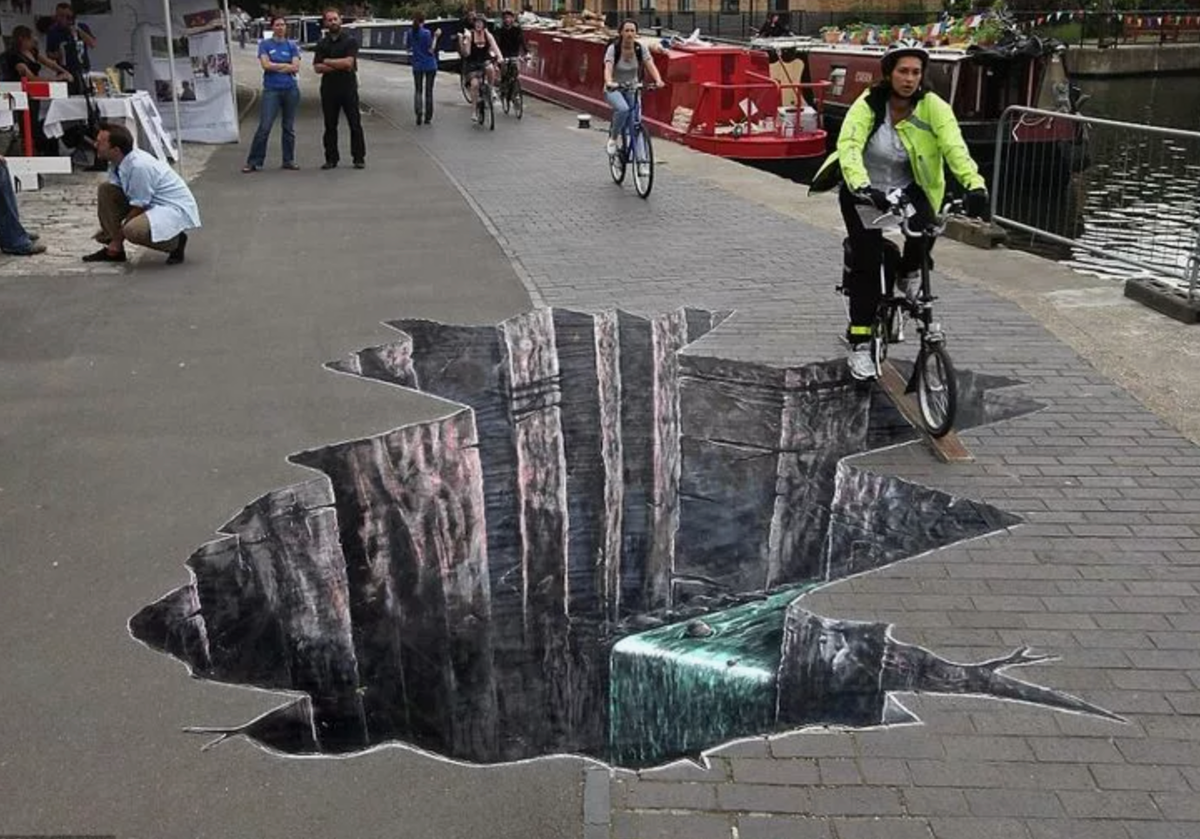 Друг вид оптичка илузија што е можна само кога мајстор на својот занает ќе ја преземе задачата. Уличните уметници понекогаш создаваат толку реалистични слики што е едноставно невозможно да не им се верува.