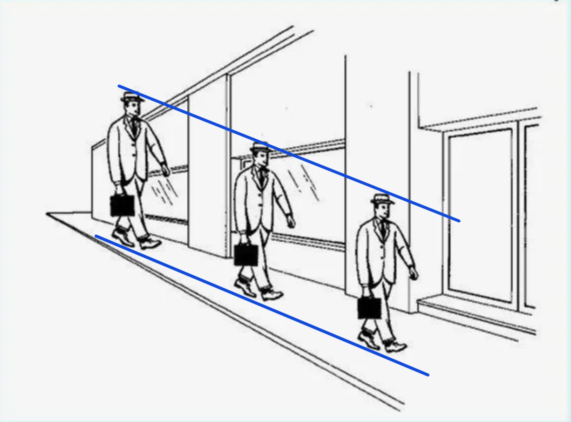 Повеќето од вас веројатно ќе одговорат дека тоа е оној што е поблиску до левиот раб на сликата (или последниот во насока на движење). Сепак, во реалноста, сите овие мажи се со иста големина. Вака можете да го видите тоа.