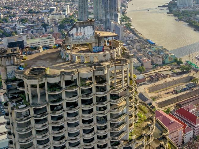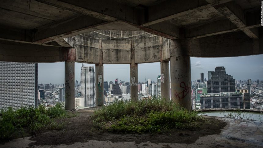 Но, ако шетате по улиците на Банкок денес, ќе ве пречека гол 49-катен бетонски гигант – напуштен, недовршен, страшен, расфрлен со графити. Во времето на изградбата би помислиле дека треба да платите за да влезете внатре, а сега имате чувство дека некој треба да ви плати за да зачекорите во таа кула на страв.