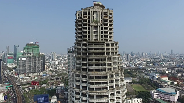 Но, ако шетате по улиците на Банкок денес, ќе ве пречека гол 49-катен бетонски гигант – напуштен, недовршен, страшен, расфрлен со графити. Во времето на изградбата би помислиле дека треба да платите за да влезете внатре, а сега имате чувство дека некој треба да ви плати за да зачекорите во таа кула на страв.