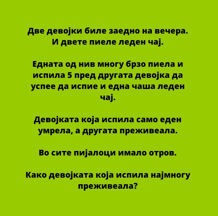 Секоја загатка, мозгалка си има свој придонес за доброто на нашиот ум. Секојдневното решавање на проблеми станува полесно со ваков вид на мозгалки и затоа не пропуштајте ја оваа дневна доза на „острилка“ за умот.