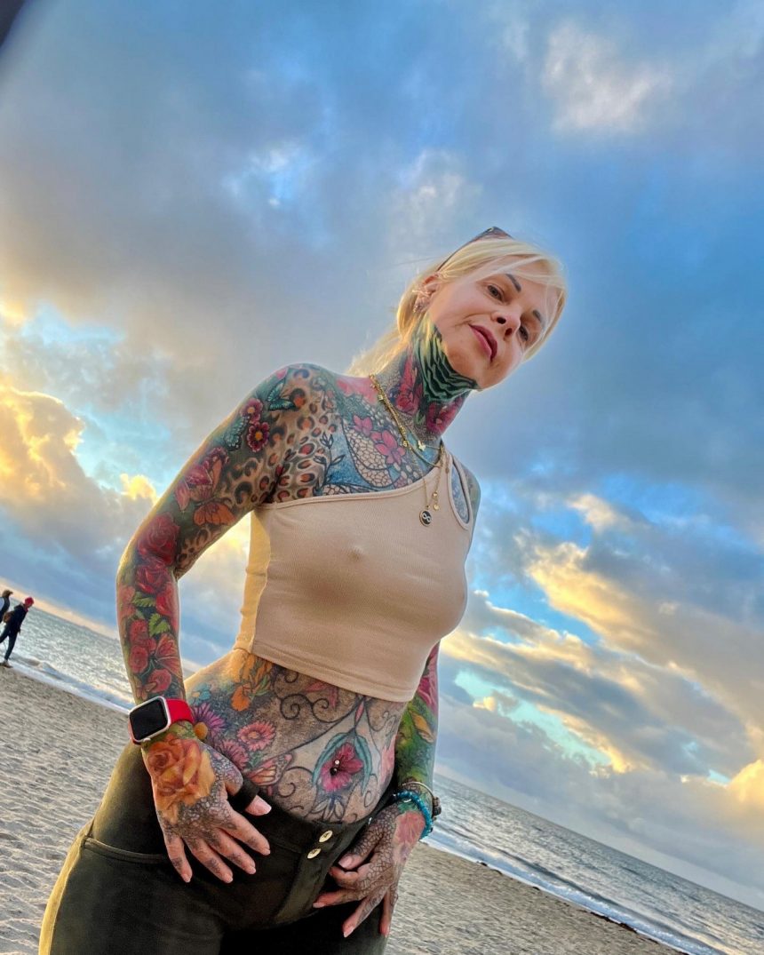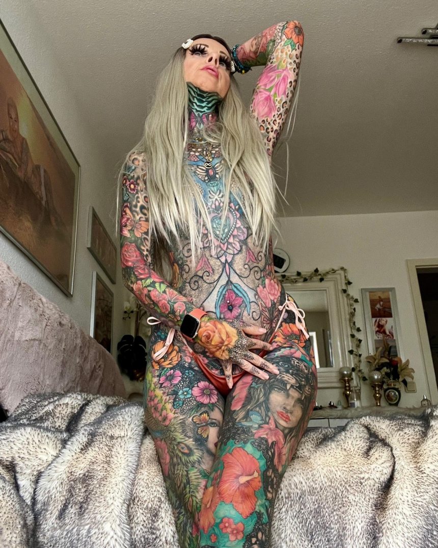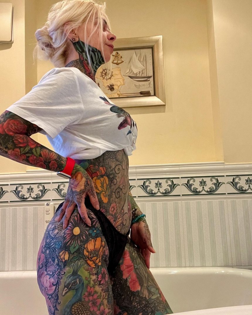 Тетовирана згодна баба оди топлес за да ја покаже колекцијата на тетоважи од 28.500 евра