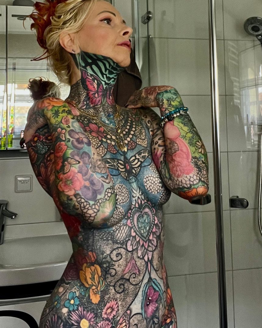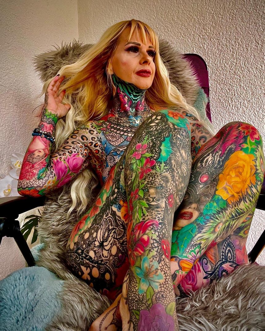 56-годишната дама, која е воедно и баба, од Германија ги собра своите долги русокоси прамени во пунџа за да ги покаже своите прекрасни тетоважи.