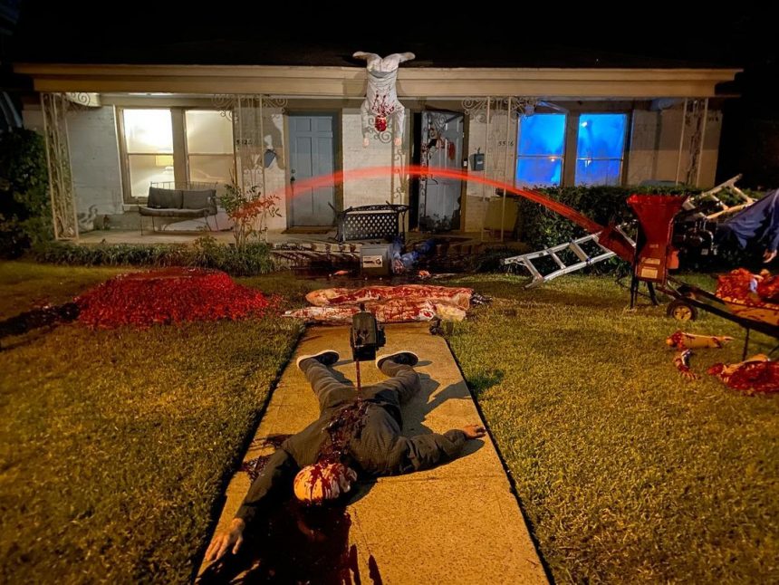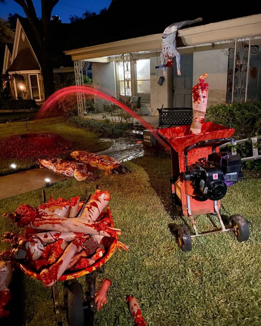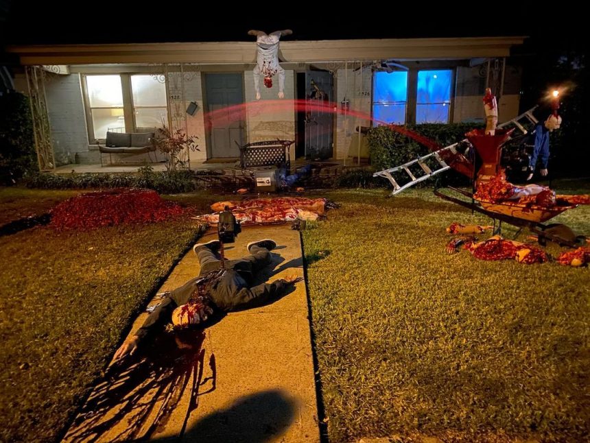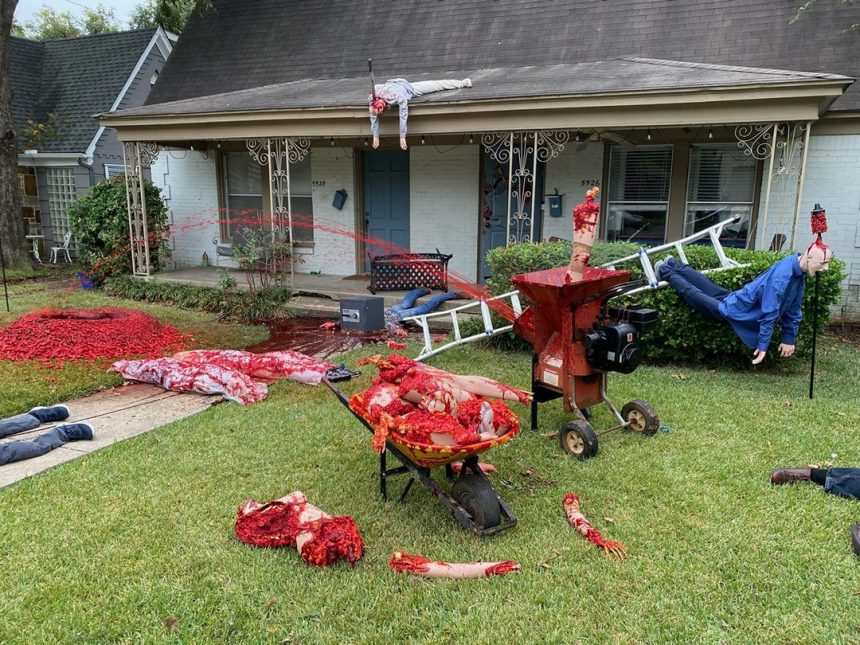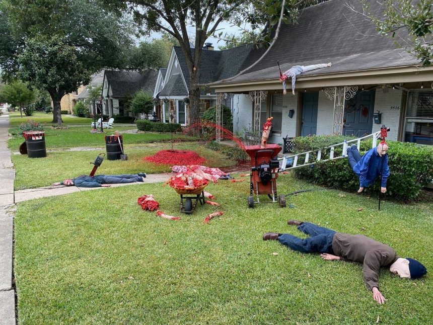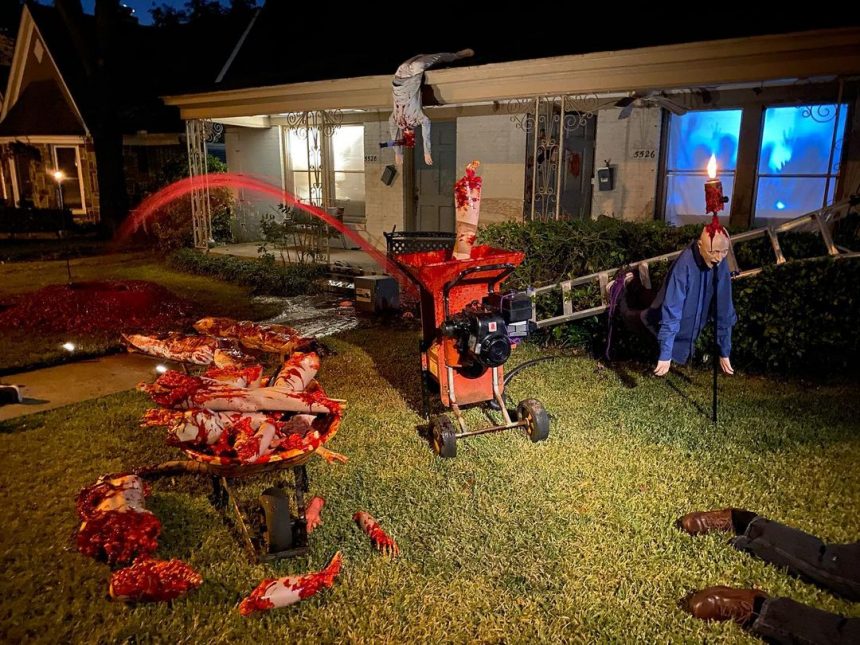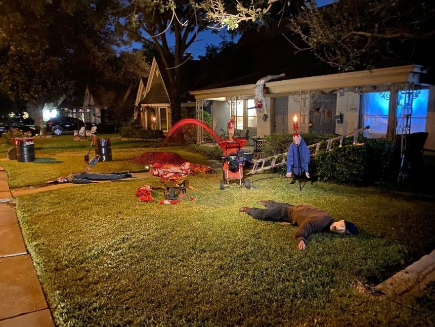 Човекот од Тексас, чии крвави „украси“ за Ноќта на вештерките предизвикаа бројни посети на полицијата минатата година, нагласено го засили ужасот со новиот приказ на тревникот овој октомври, вклучително и реновирана машина за сечење дрво што му истура лажна крв во неговиот двор.