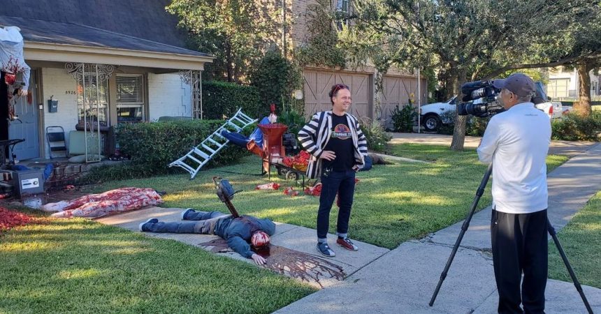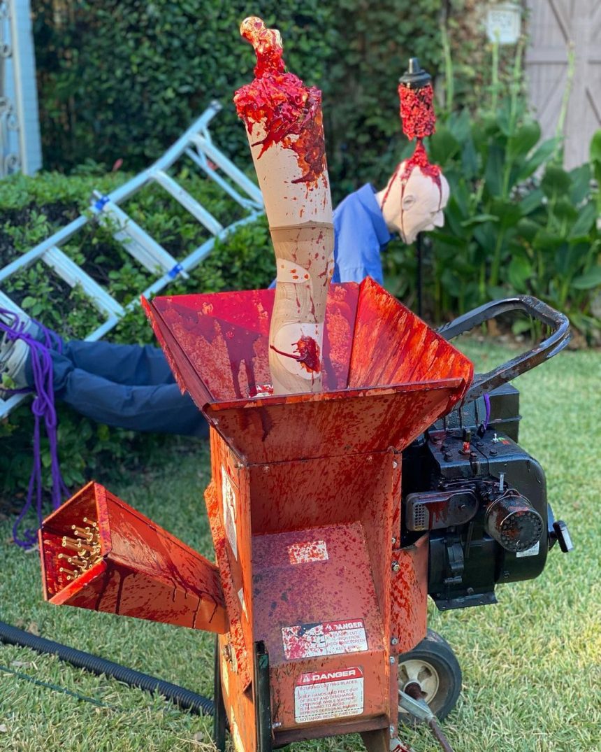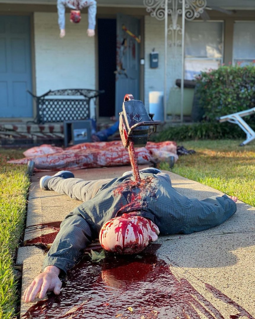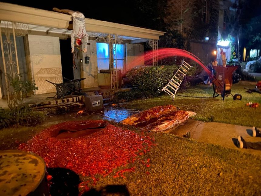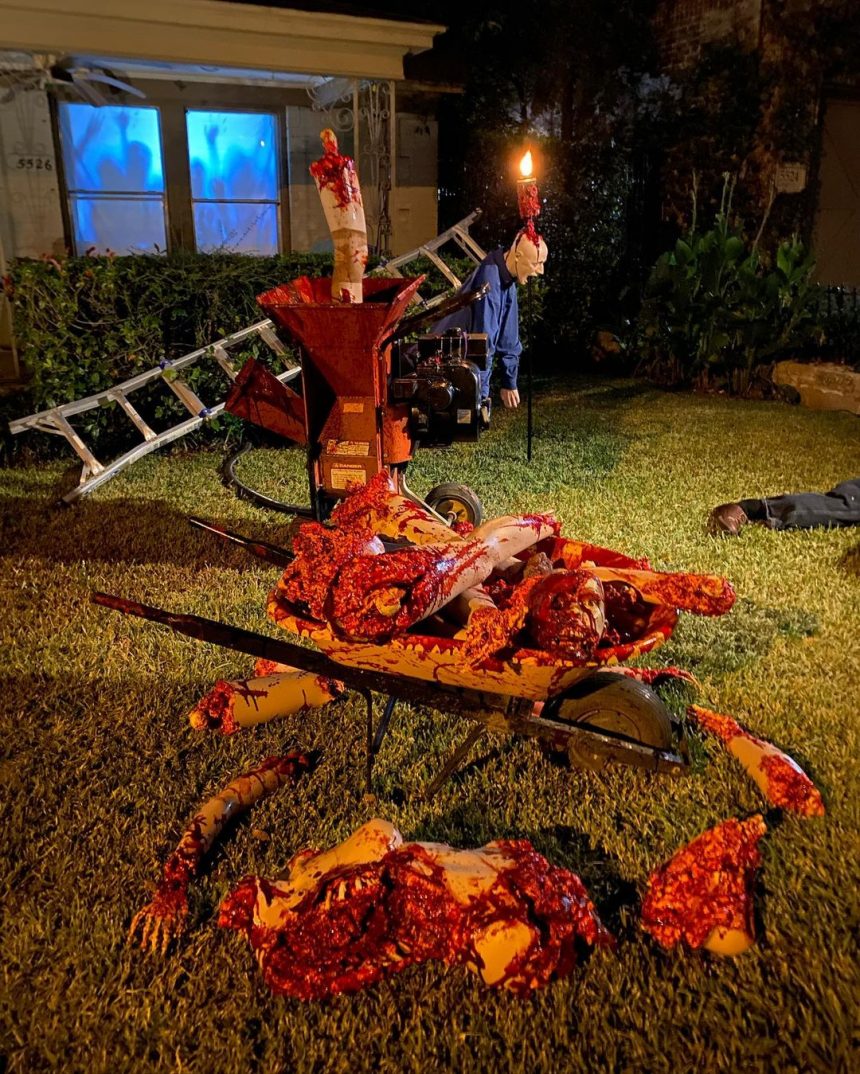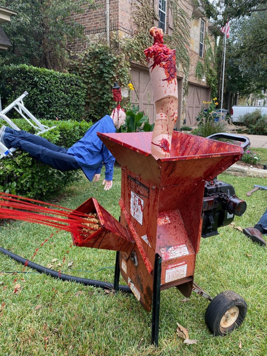Човекот од Тексас, чии крвави „украси“ за Ноќта на вештерките предизвикаа бројни посети на полицијата минатата година, нагласено го засили ужасот со новиот приказ на тревникот овој октомври, вклучително и реновирана машина за сечење дрво што му истура лажна крв во неговиот двор.