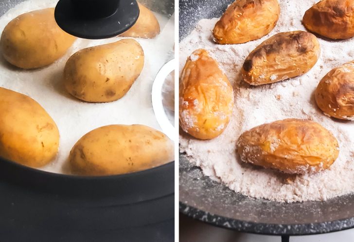 Рецептот е едноставен: ставете сол на тавата за пржење. Слојот треба да биде најмалку 2 cm. Ставете компири на одозгора, покријте ги со капакот и уклучете ја ринглата на средна температура. Гответе 40 минути, вртејќи го компирот од време на време.