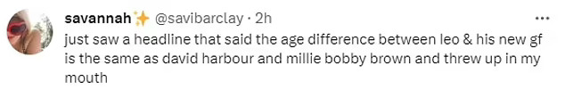 „Само што видов некој да рече дека Лео ди Каприо и неговата нова девојка имаат ист јаз во години како Дејвид Харбор и Мили Боби Браун… Ќе повртам“, додаде друг.