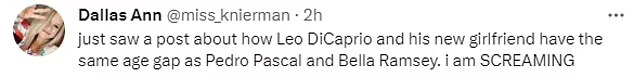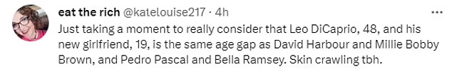 „За момент се сетив дека Лео ди Каприо (48) и неговата нова девојка (19) имаат иста старосна разлика како Дејвид Харбор и Мили Боби Браун и Педро Паскал и Бела Ремзи. Се наежив“, напиша едно лице.