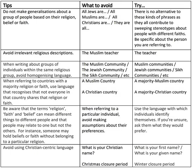 Потоа, во табела која го советува персоналот што не треба да им кажува на студентите, тие се повикани да го избегнуваат терминот „Божиќен завршен период“ и да го заменат со „зимски завршен период“. Целта на ова е „да се избегне употребата на христијанско-центричен јазик“.