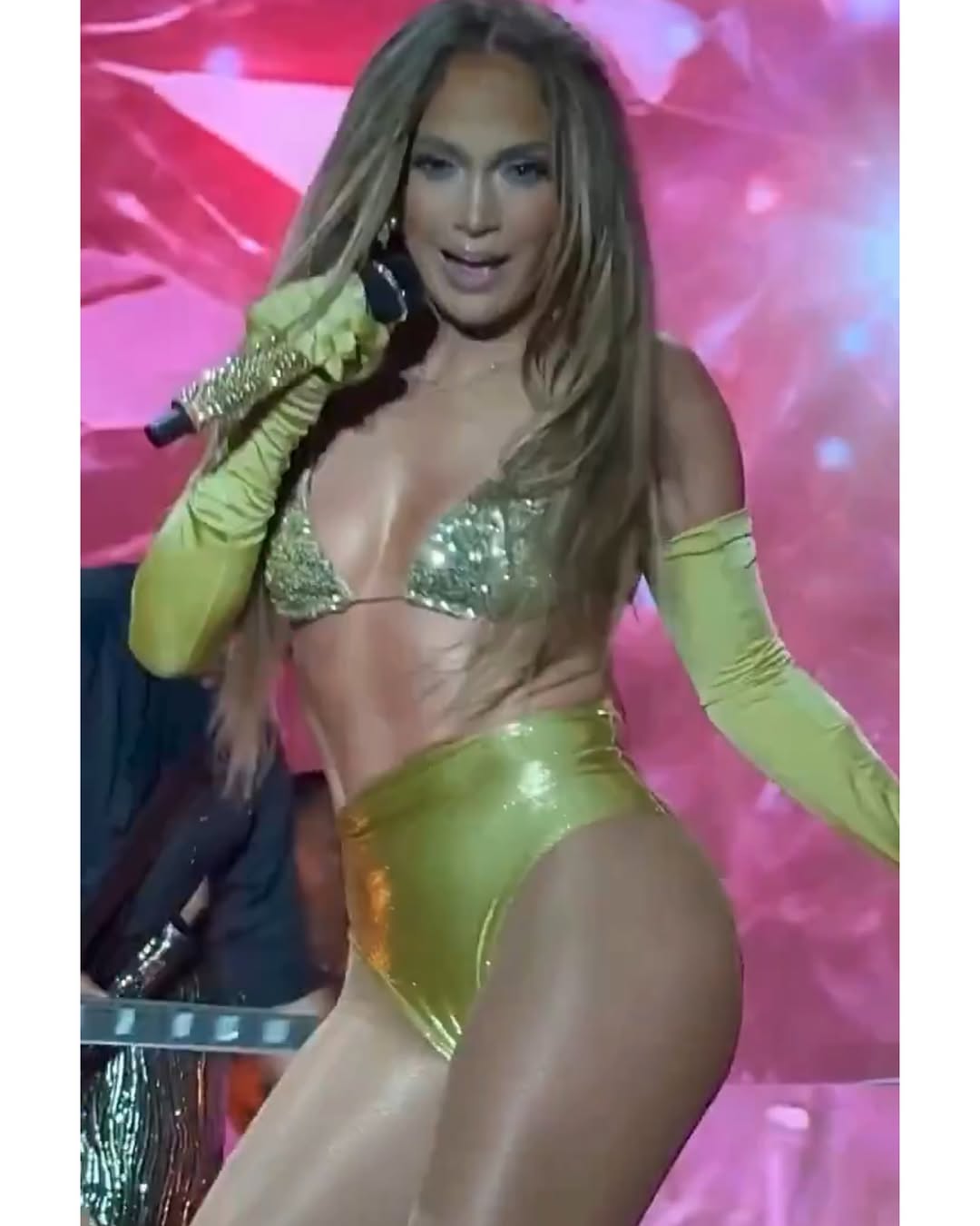 Облечена во блескав зелен бикини топ и свилени ракавици, Лопез изненадено остана во високи, зелени гаќи кога бисерната сукња ѝ падна на сцената. Во моментот, таа не само што го задржа достоинството, туку и се заблагодари на публиката со драматична поза.