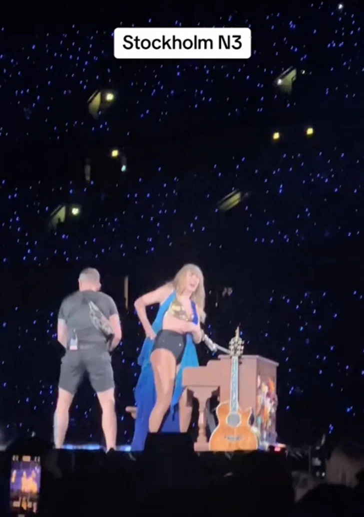 Тејлор Свифт имаше мал проблем со аутфитот додека настапуваше во Шведска. Видеото споделено на социјалните мрежи покажува дека Свифт на третата вечер од нејзината турнеја „Ерас во Стокхолм, Шведска, приспособува микрофон закачен на задниот дел од нејзината облека. 34-годишната поп-ѕвезда се справи проблем со звукот и облеката, но со сето тоа како професионалец: таа самоуверено го одврза целиот син фустан на сцената за да го реши проблемот.