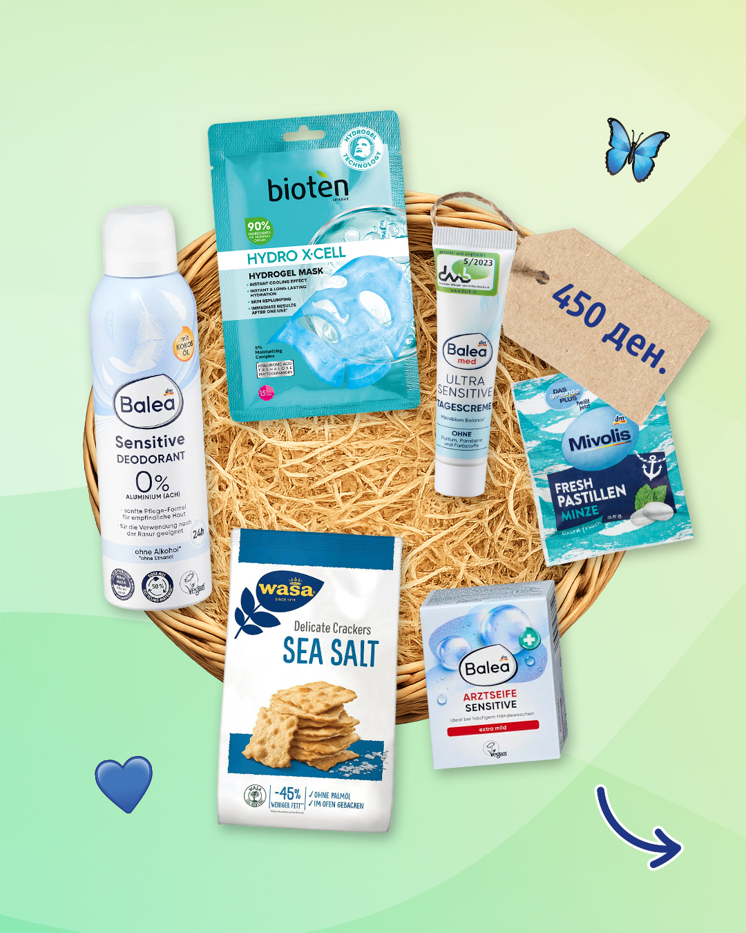 Сината велигденска кошничка обединува шест производи со вкупна цена од 450 денари и е одличен избор за секојдневна нега, хигиена и освежување. Balea Sensitive дезодорансот со кокосово масло овозможува сигурна заштита и е погоден и за чувствителна кожа, што го прави практичен избор за секој ден. Mivolis Fresh пастилите со вкус на нане носат дополнително чувство на свежина и лесно може да се најдат во чанта или ранец кога се потребни во текот на денот. Bioten Hydro X∙Cell маската за лице внесува момент на нега и интензивна хидратација, а воедно остава и пријатно чувство на разладување на кожата. Wasa крекерите со морска сол се вкусно дополнување во кошничката и се идеални за лесна ужинка во секое време. Balea нежниот сапун е создаден за често миење на рацете, без да ја суши кожата. За заокружена рутина, тука е и Balea MED Ultra Sensitive дневната крема, која нежно ја хидрира и смирува чувствителната кожа.