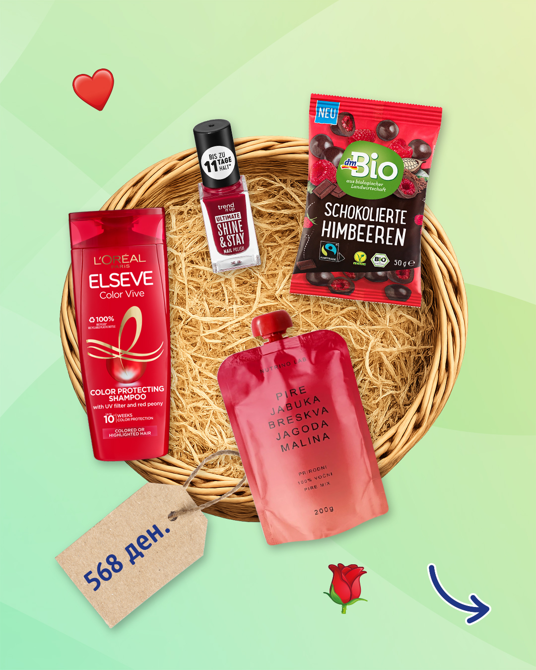 Црвената велигденска кошничка содржи четири производи со вкупна цена од 568 денари и претставува одлична комбинација од производи за убавина, нега и мало слатко задоволство. Во неа може да се вклучат L’Oréal Paris Elseve Color-Vive шампонот за обоена коса, кој помага во заштита на бојата и ѝ дава сјај на косата, Nutrino Lab овошното пире со јаболко, праска, јагода и малина, trend !t up Ultimate Shine & Stay лакот за нокти за долготраен сјај, како и dmBio чоколадираните малини во темно чоколадо, кои внесуваат вкусна и впечатлива нота во кошничката.