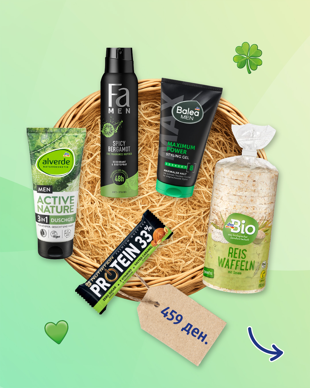 Зелената велигденска кошничка за мажите обединува пет производи со вкупна цена од 459 денари и е наменета за секојдневна нега, хигиена и практични моменти во текот на денот. Во оваа комбинација може да се најдат alverde Active Nature 3во1 лосионот за тело, лице и коса, Fa Men Spicy Bergamot дезодорансот за долготрајна свежина, dmBio оризовите галети со сусам како лесна закуска, GO ON 33% протеинската плочка и Balea MEN Maximum Power гелот за лесно стилизирање и цврсто држење на косата.