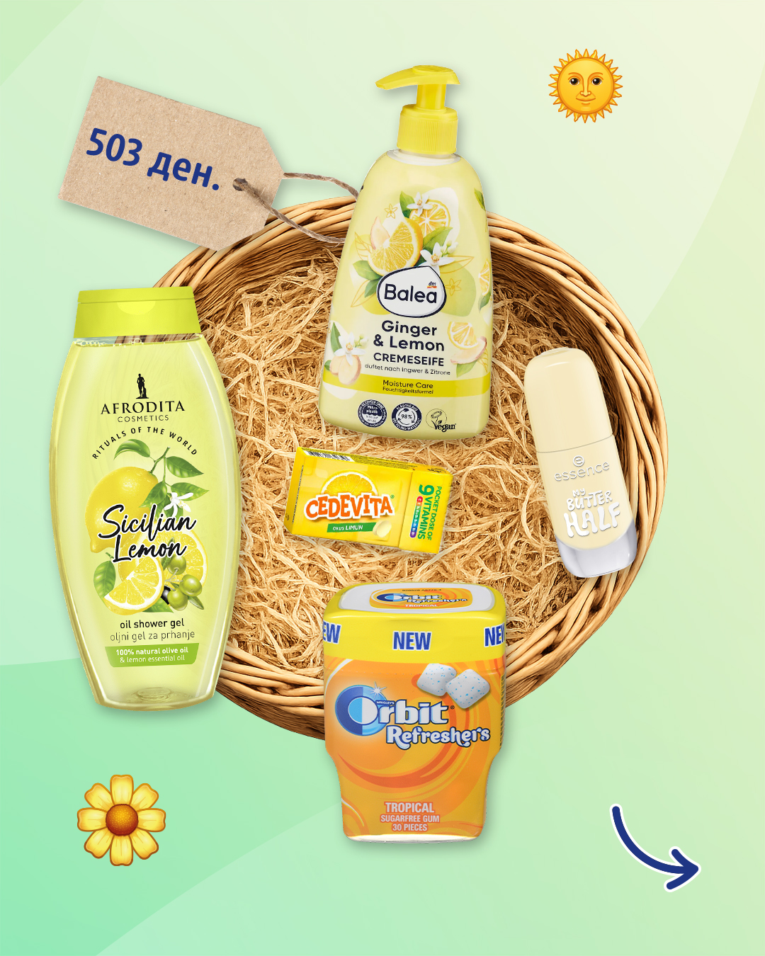 Жолтата велигденска кошничка вклучува пет производи со вкупна цена од 503 денари и носи свежина, ведрина и производи што внесуваат убаво расположение во секојдневието. Во неа свое место можат да имаат Afrodita Sicilian Lemon маслениот гел за туширање, Balea Ginger & Lemon течниот сапун, essence MY BUTTER HALF лакот за нокти, Cedevita бонбоните со 9 витамини и Orbit Tropical гумите за џвакање без шеќер. Оваа комбинација е идеална за сите што сакаат свежи мириси, нежен момент и практични мали додатоци во една кошничка.