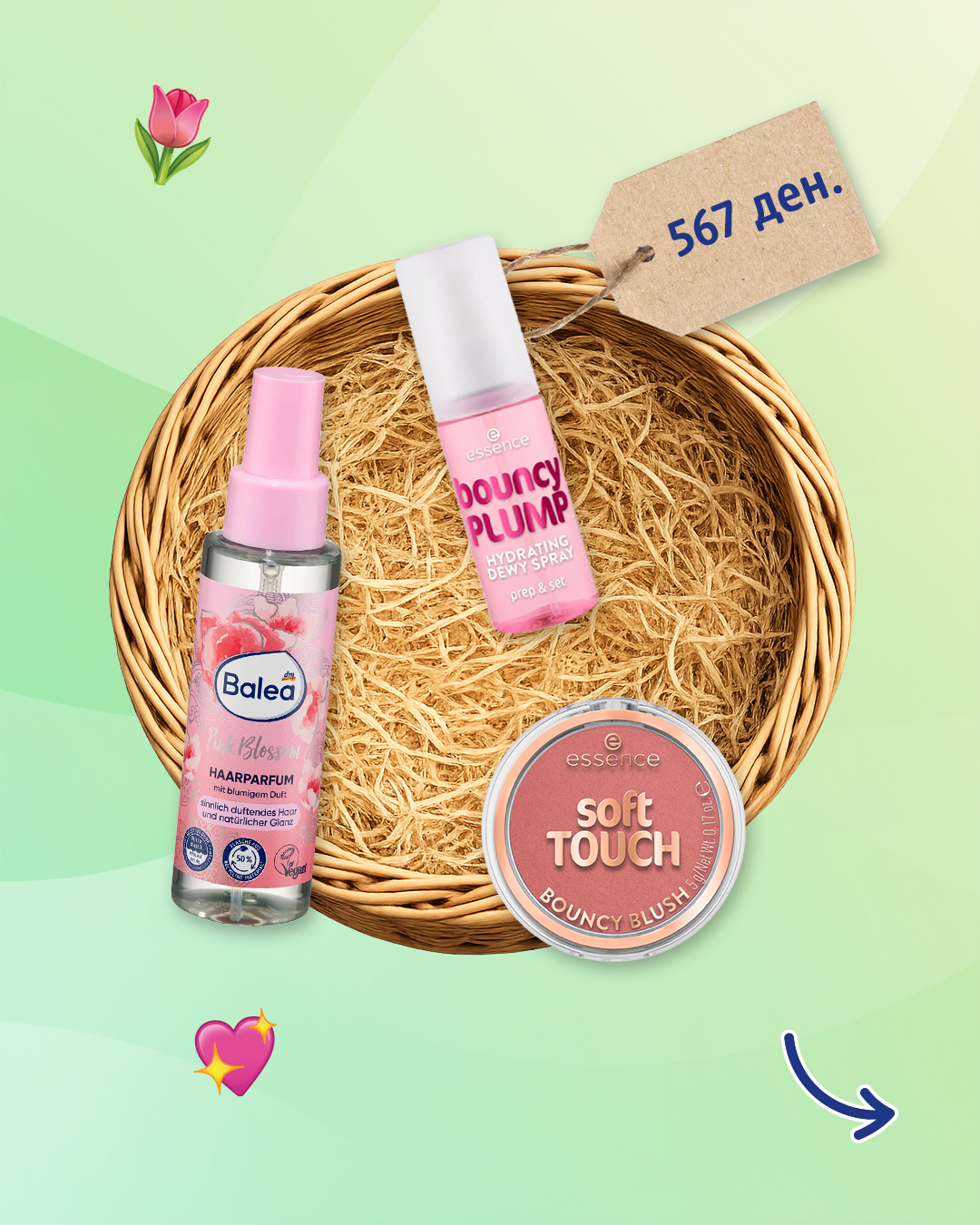 Оваа велигденска кошничка со три производи, со вкупна цена од 567 денари, е идеален избор за сите љубители на производи за убавина и внимателно одбрани мали задоволства. Во неа може да се најдат essence Soft Touch руменилото за природен и свеж изглед, Balea Pink Blossom парфемот за коса со цветно-свеж мирис и essence bouncy plump спрејот за лице, кој овозможува хидриран и блескав финиш. Ова е едноставна, но впечатлива комбинација што лесно може да стане дел од секојдневната рутина за нега и убавина.
