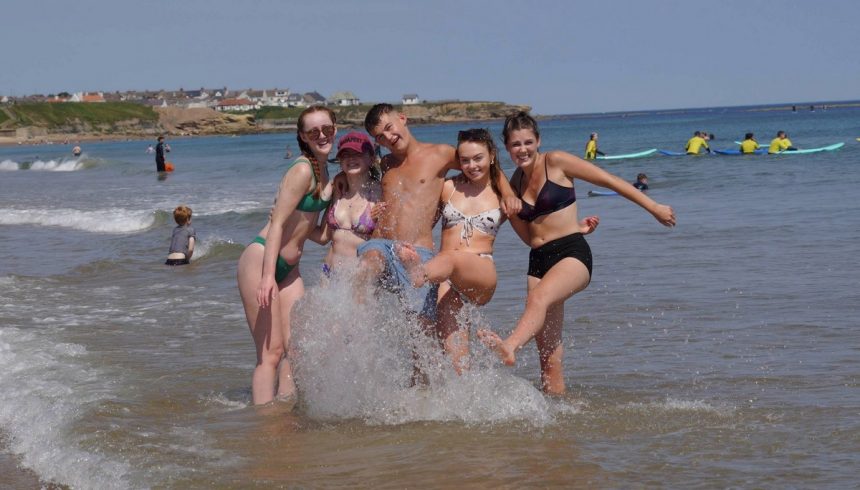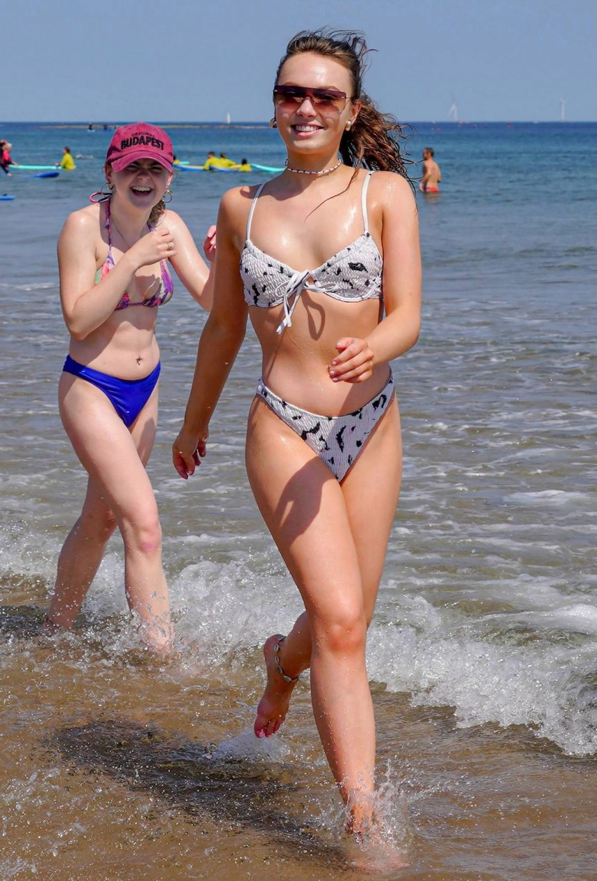 16.07.2021. Warm sunny weather, Barry Island, South Wales. A group of 19 & 20 year old girls from the midlands enjoy a break on Barry Island beach. WALES NEWS SERVICE