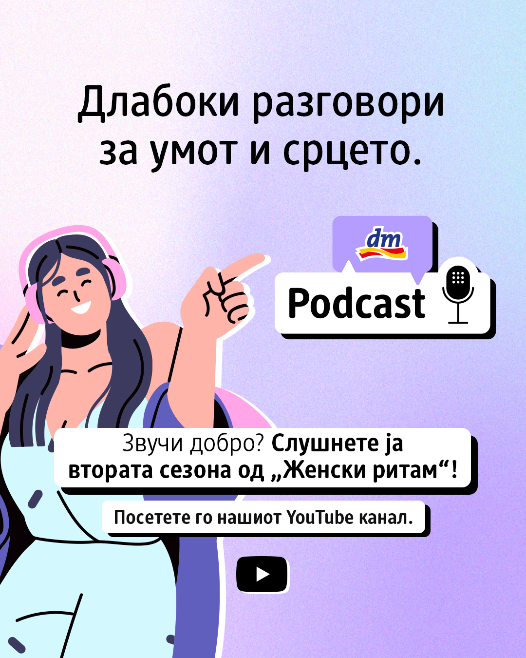 Погледнете ги епизодите од втората сезона на поткастот „Женски ритам“, кои се достапни само на YouTube каналот на dm drogerie markt Македонија.