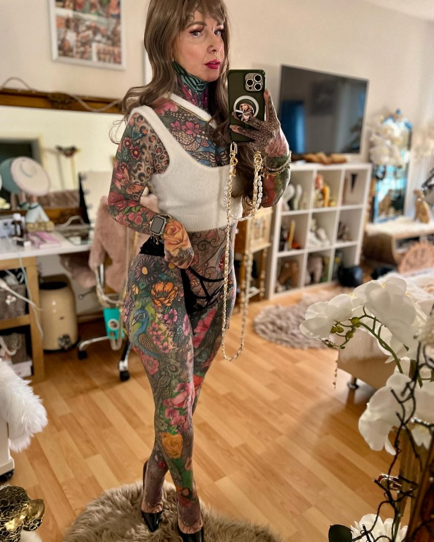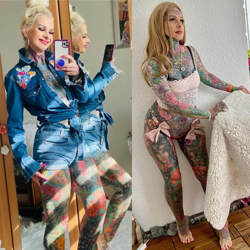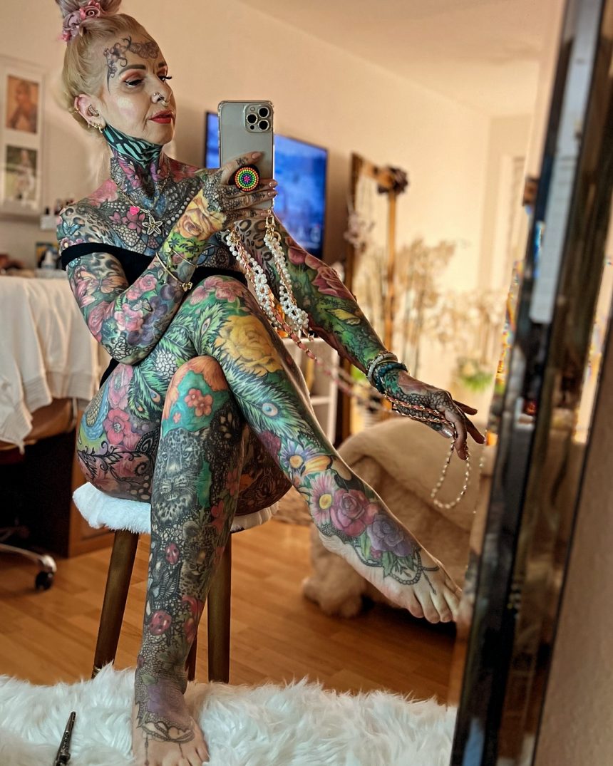 Со текот на годините, бабата измина долг пат, а сега нејзиното тело е речиси целосно покриено со тетоважи. Колку што можеме да видиме, на нејзиното лице останало многу малку простор.