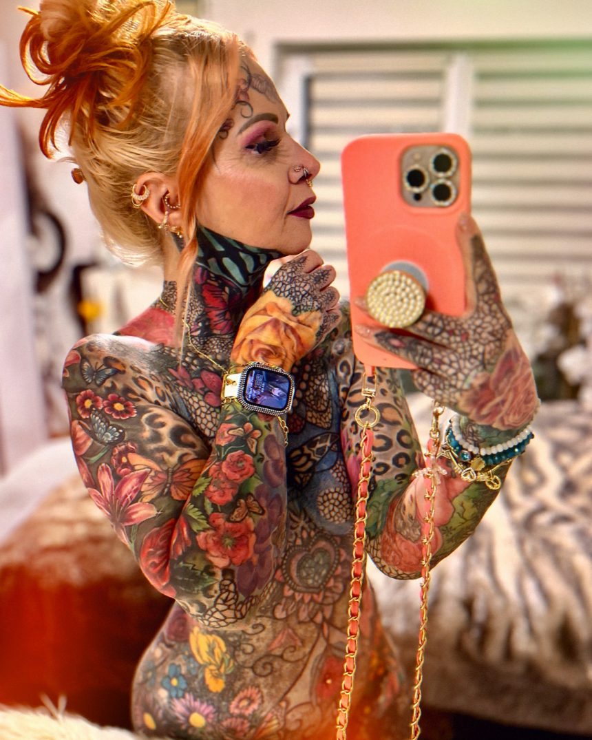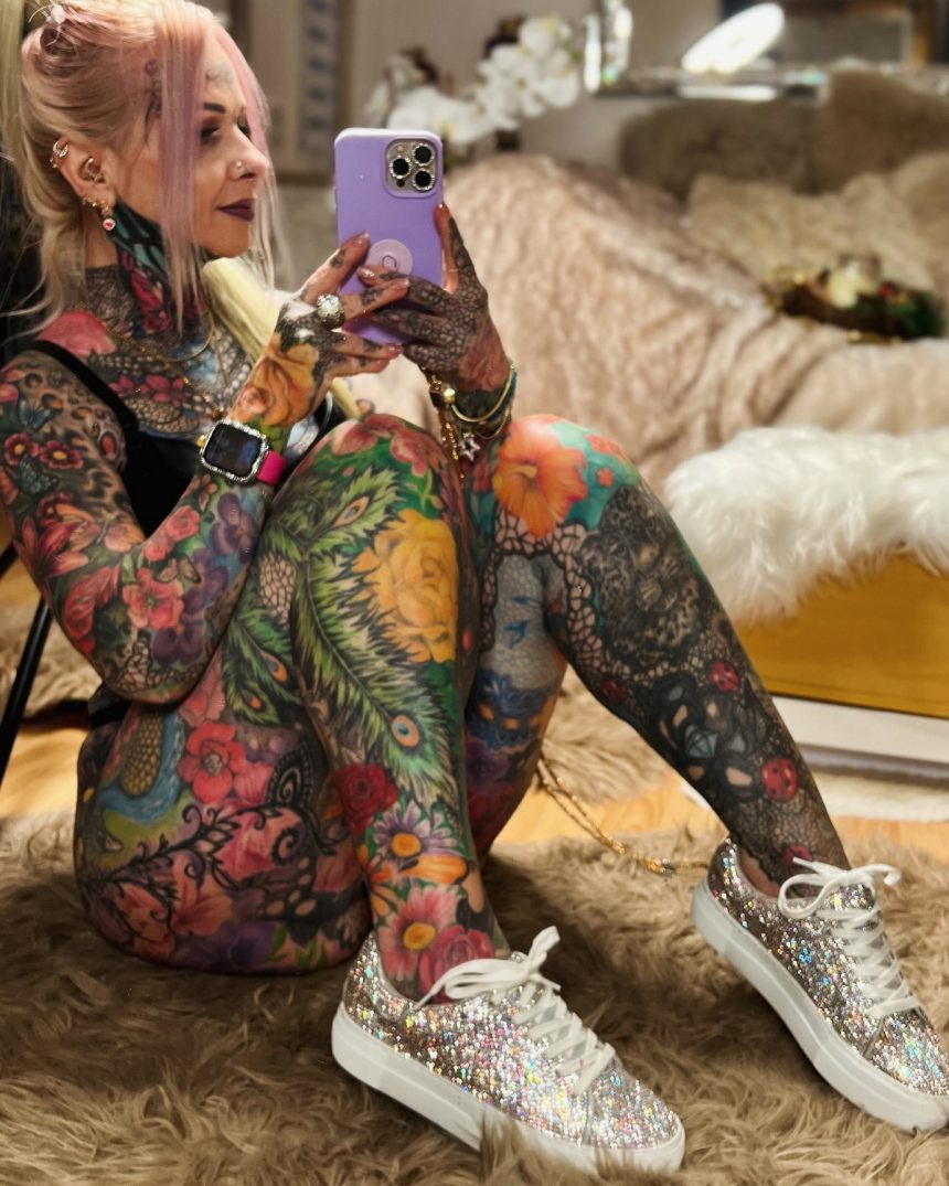 Засега, единствениот дел од нејзиното тело што не е покриен со мастило е поголемиот дел од нејзиното лице и не е јасно дали таа ќе ја покрие таа област наскоро.