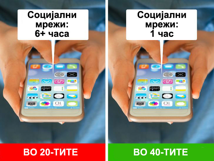 Секој знае колку социјалните медиуми одземаат многу време и колку е лесно да се трошат часови по часови скролувајќи низ истите неколку апликации. Меѓутоа, луѓето во четириесеттите имаат тенденција да го прават тоа многу помалку и можат подобро да управуваат со своето време и добро да го искористат. Според податоците од Pew Research Center, возрасните во четириесеттите имаат тенденција да користат социјални медиуми многу помалку од помладите, а 56% од нив исто така рекле дека нема да биде тешко да се откажат од тоа засекогаш.