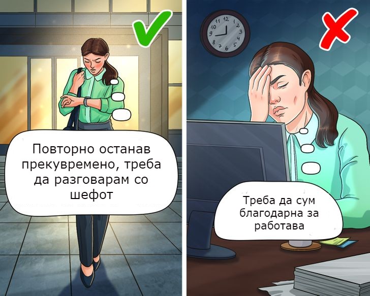 Сето ова доведува до прекумерна работа, зголемување на стресот и незадоволство од вашата работа и вашиот живот. За да го избегнете, запомнете дека не му должите ништо на вашиот работодавец: не треба да бидете благодарни само затоа што „ви дозволија“ да работите за нив.