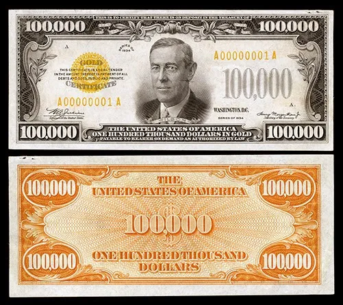 Во текот на крајот на 1920-тите и почетокот на 1930-тите години, САД печателе банкноти со високи апоени: 500, 1.000, 5.000 и 10.000 долари. Највредната меѓу нив била банкнотата од 100.000 долари, со портретот на претседателот Вудро Вилсон. Оваа банкнота била златен сертификат, симболизирајќи сопственост на злато без физичко поседување на металот.